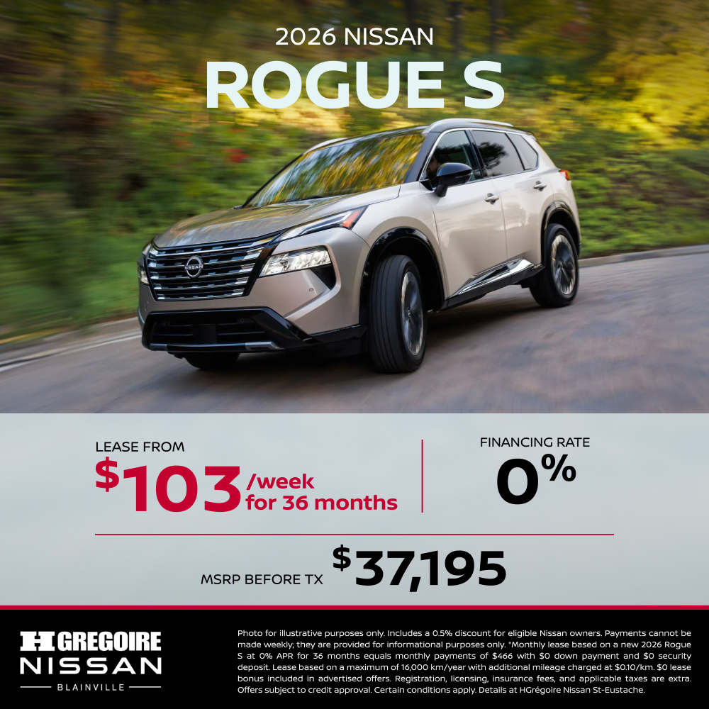 This 2026 Nissan Rogue is available at HGrégoire Nissan Blainville (Plateforme) in Blainville. Contact our sales team or come meet us at 705 Bd Curé-Labelle, for more details, for a test drive, or to make a reservation.