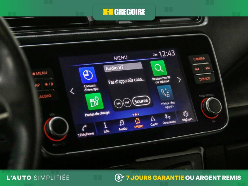 • Radio : NissanConnect EV avec système de navigation -comprend : apple CarPlay, Android Auto, écran couleur de 8 po avec commande tactile multifonction, système de navigation porte à porte de Nissan avec cartographie en 3D et imagerie satellitaire, radio SiriusXM avec caractéristiques audio de pointe, système de navigation connecté de Nissan avec commande vocale, reconnaissance vocale Nissan pour fonctions audio et de navigation, SiriusXM Traffic, SiriusXM Travel Link (prévisions météorologiques, prix du carburant, horaires de cinéma et résultats sportifs), port USB pour interface iPod et autres appareils compatibles, Siri Eyes Free, système téléphonique mains libres Bluetooth, lecture audio en continu au moyen du système Bluetooth, messagerie texte mains libres et 4 haut-parleurs